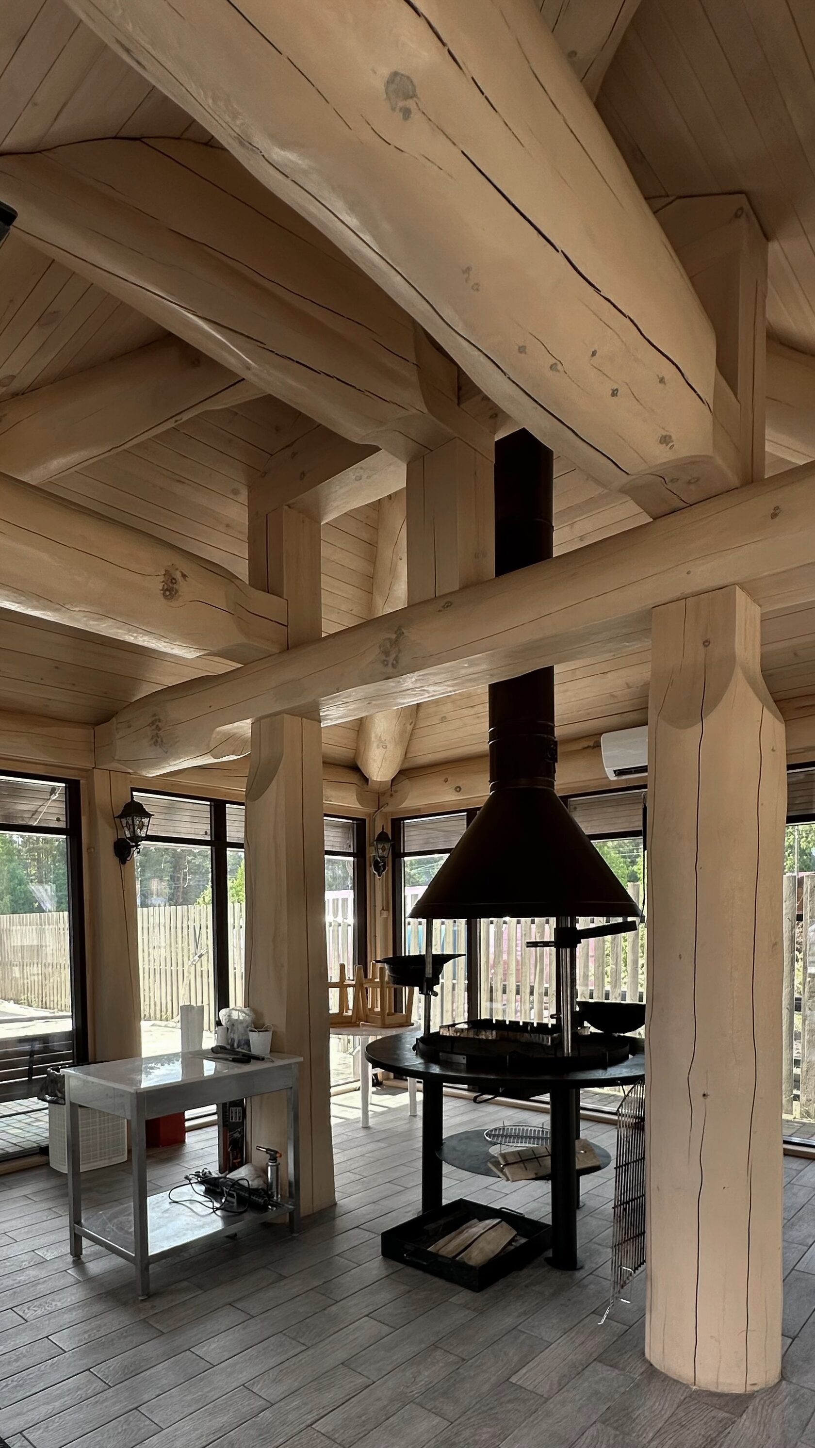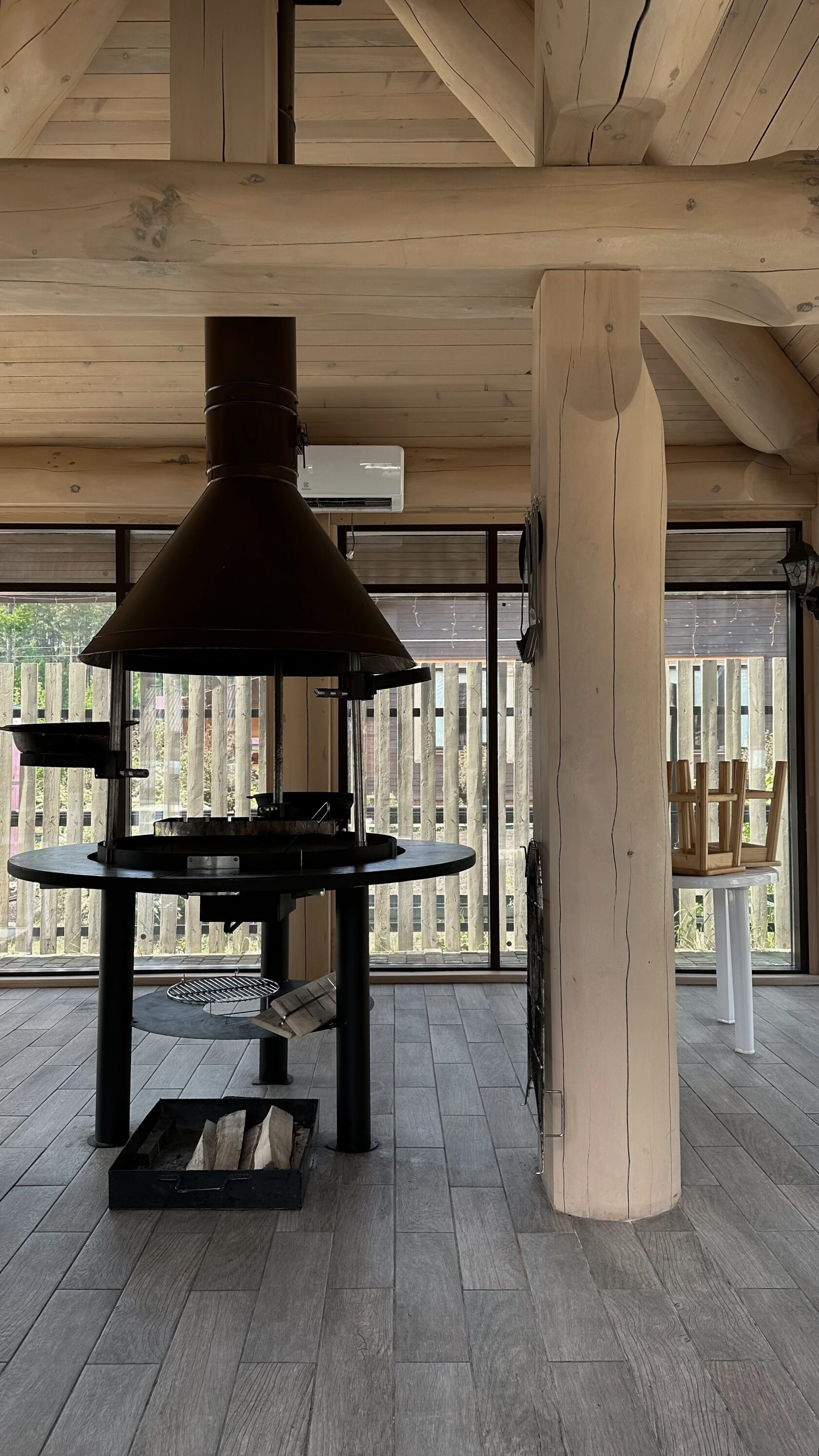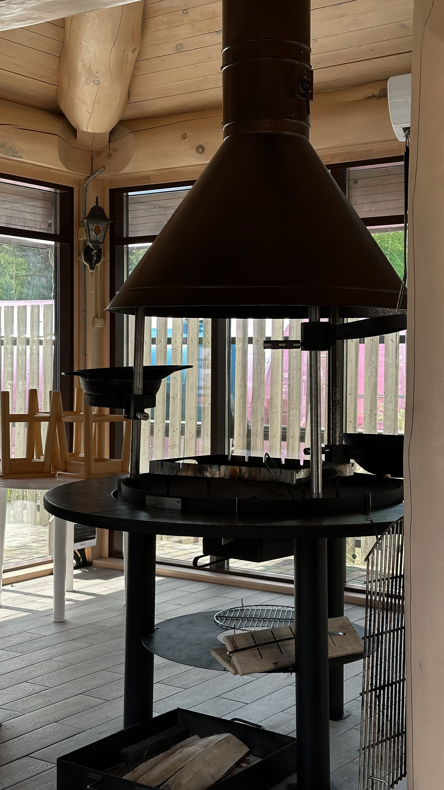 В беседке установлен финский гриль-барбекю "Fingrill Nordic", который позволяет с комфортом готовить блюда, а так же использовать его как обычный очаг.